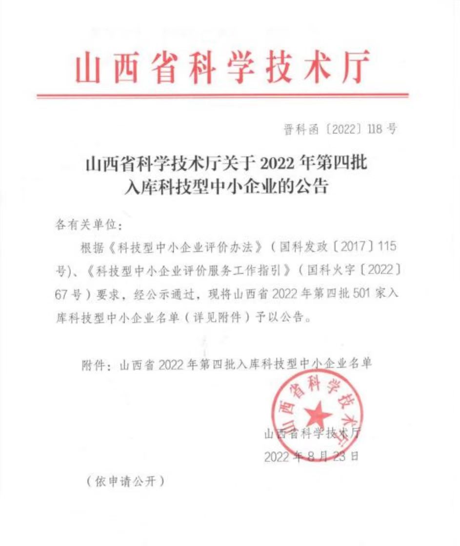 根據(jù)《科技型中小企業(yè)評(píng)價(jià)辦法》(國(guó)科發(fā)政[2017]115號(hào))、《科技型中小企業(yè)評(píng)價(jià)服務(wù)工作指引》(國(guó)科火字[2022]67號(hào))要求,經(jīng)公示通過,我公司入庫2022年第四批科技型中小企業(yè)。