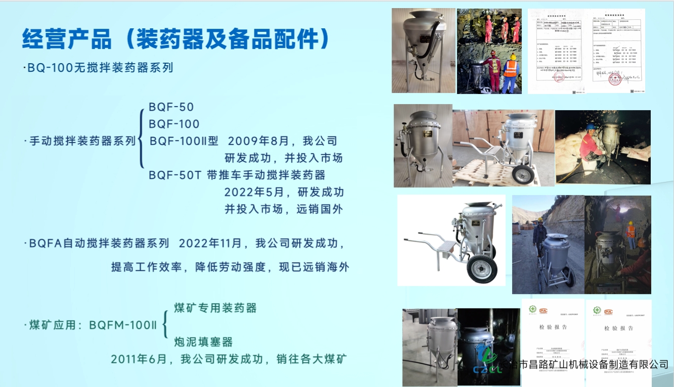 由于井下頻繁裝藥作業(yè),手動攪拌易導(dǎo)致裝藥密度不均,爆破質(zhì)量也有提升的空間,我公司經(jīng)過多次實驗,于2022年創(chuàng)新研發(fā)BQFA自動攪拌系列裝藥器,在裝藥過程中,搬運(yùn)方便,減少施工作業(yè)時間,裝藥均勻,提高工作效率,降低勞動強(qiáng)度,裝藥器的各項性能得到顯著的提高,在福建某礦山首次使用,得到礦山的大力認(rèn)可和推薦。